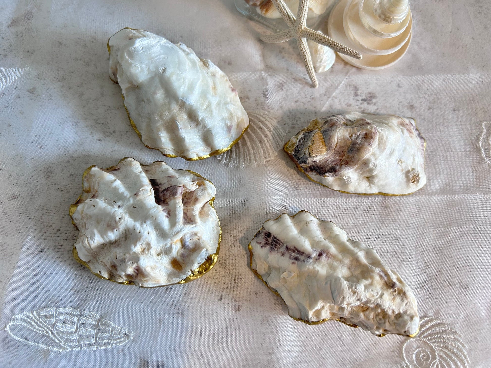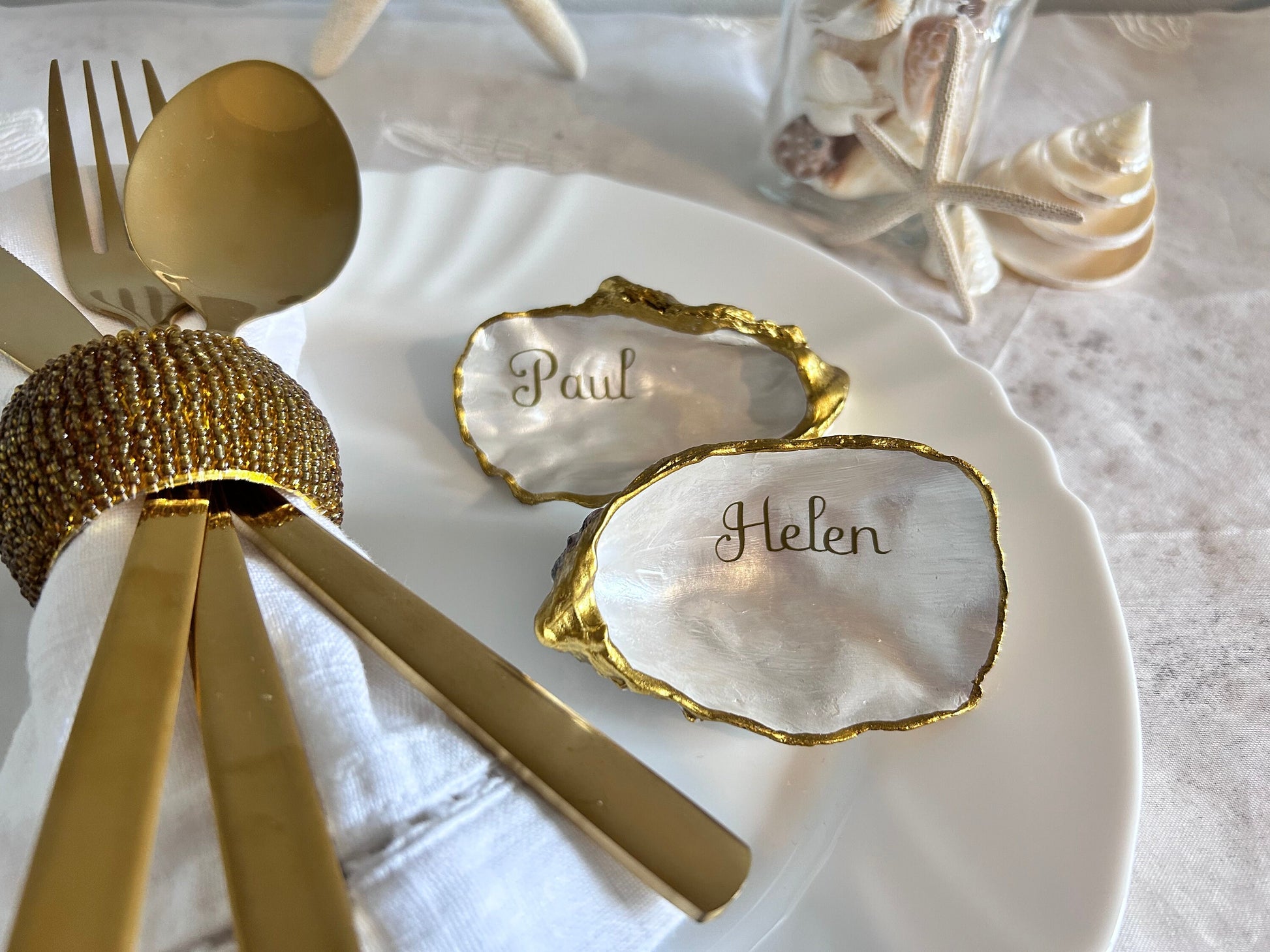 Antique Gold Oyster Shell Wedding Place Name and Favours.