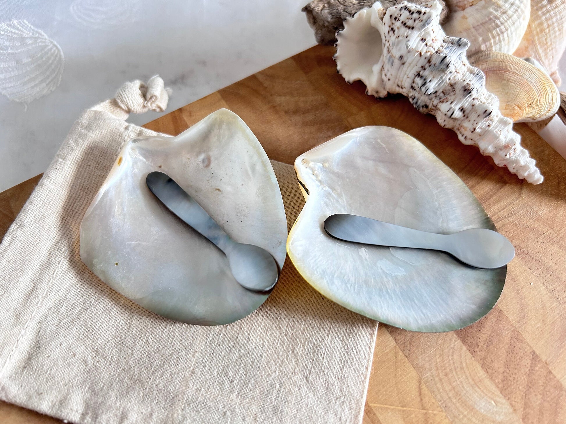 Each comes with a black lip oyster spoon which measures 6.5 cm in length. Natural elegance from the world famous South Sea Island this black lip oyster shell is perfect for your caviar with a matching mother of pearl spoon which are completely inert so will not react with the caviar.