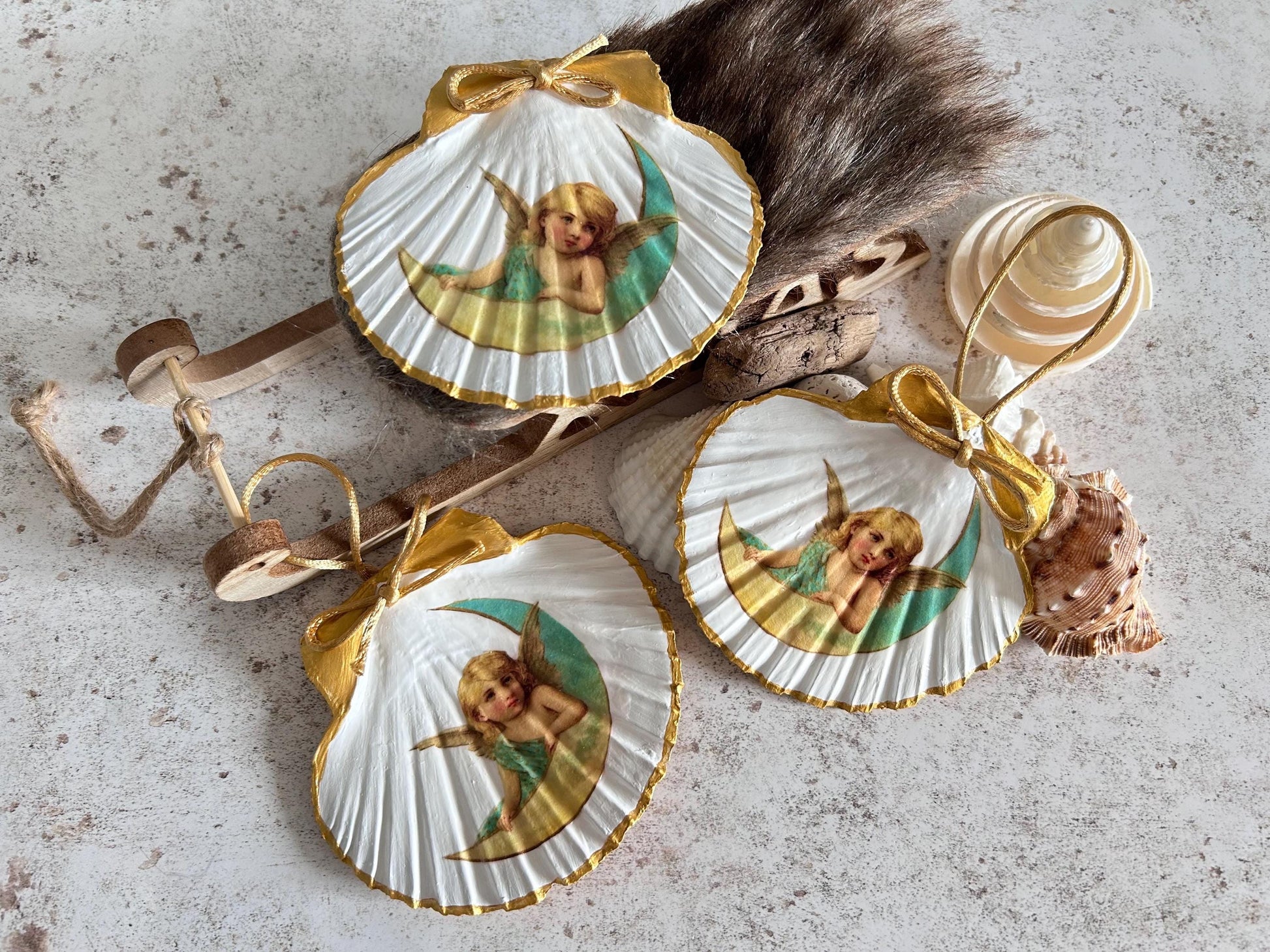 Christmas Angel Decoration. Natural Scallop Shell Hanging Ornament.