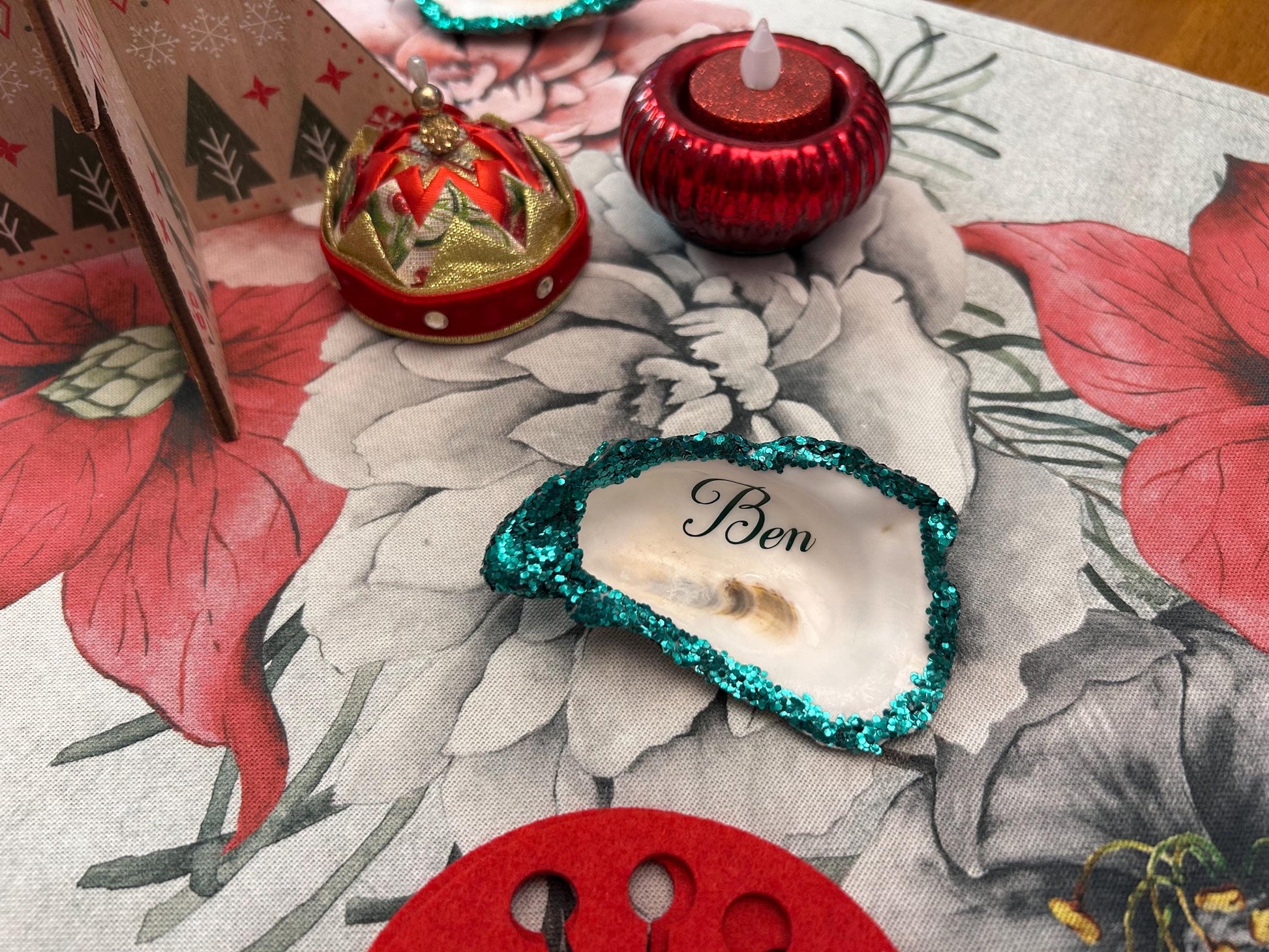 These natural oyster shells place names will add a touch of sophisticated luxury to your beach inspired wedding. Finished in a luxurious emerald green biodegradable glitter on the rims and the inside has been left natural ready to personalise with your guests names.