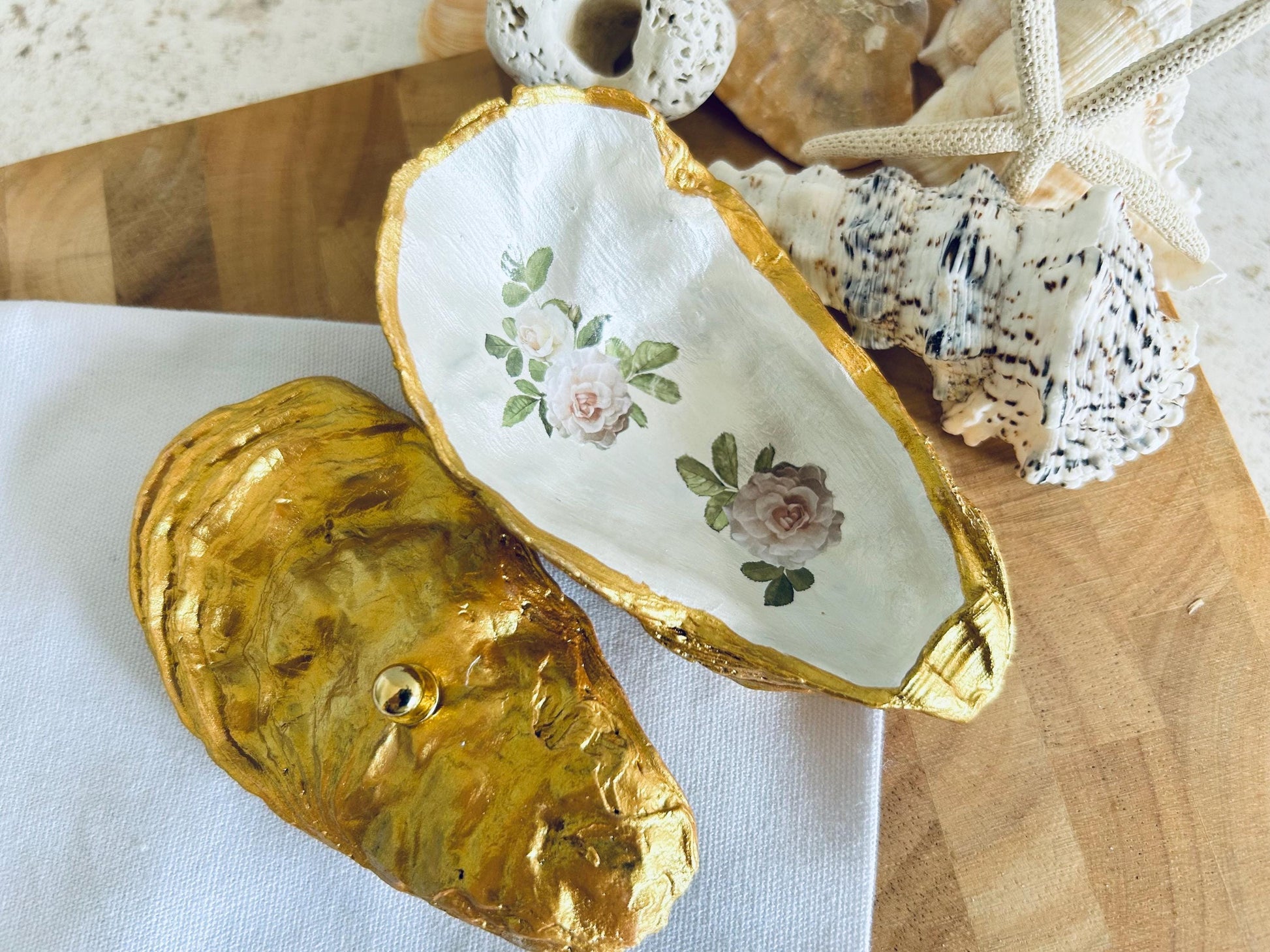 Gold Full Oyster Shell Jewellery Box with a White and Dusky Pink Rose Design.