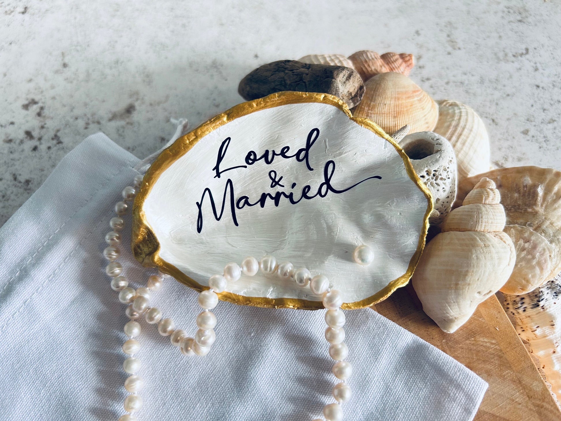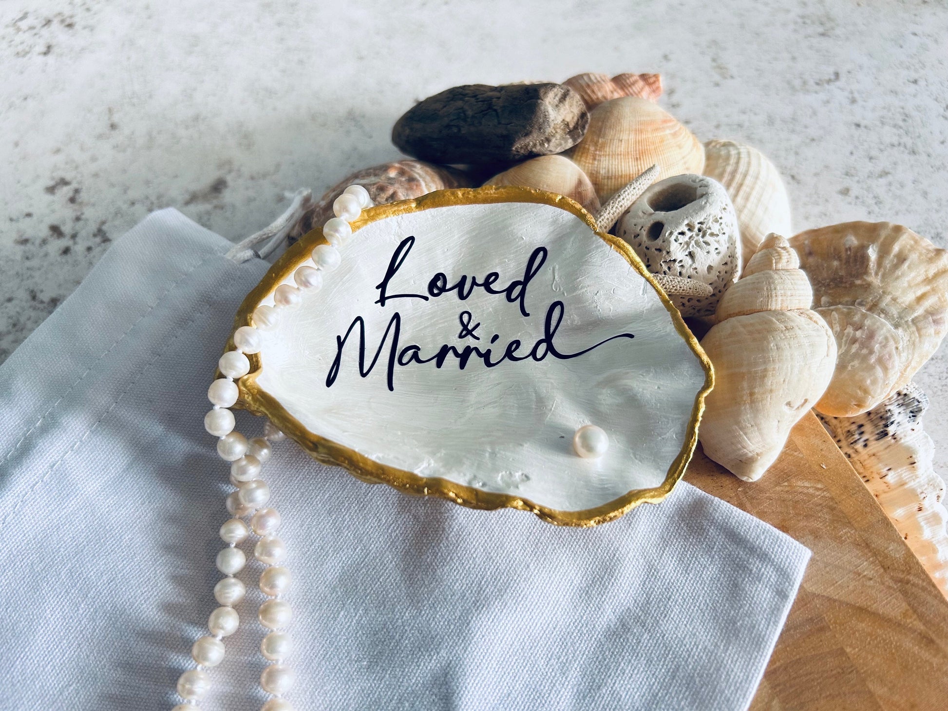 A Large natural oyster shell dish, finished in a rich gold with 'Loved & Married' and a freshwater pearl. Comes in a sustainable cotton bag for gifting. A perfect wedding gift for any couple or beach bride. The ideal present for an ocean lovers pearl or wedding anniversary for that special couple, this would make a thoughtful and unforgettable unique gift.