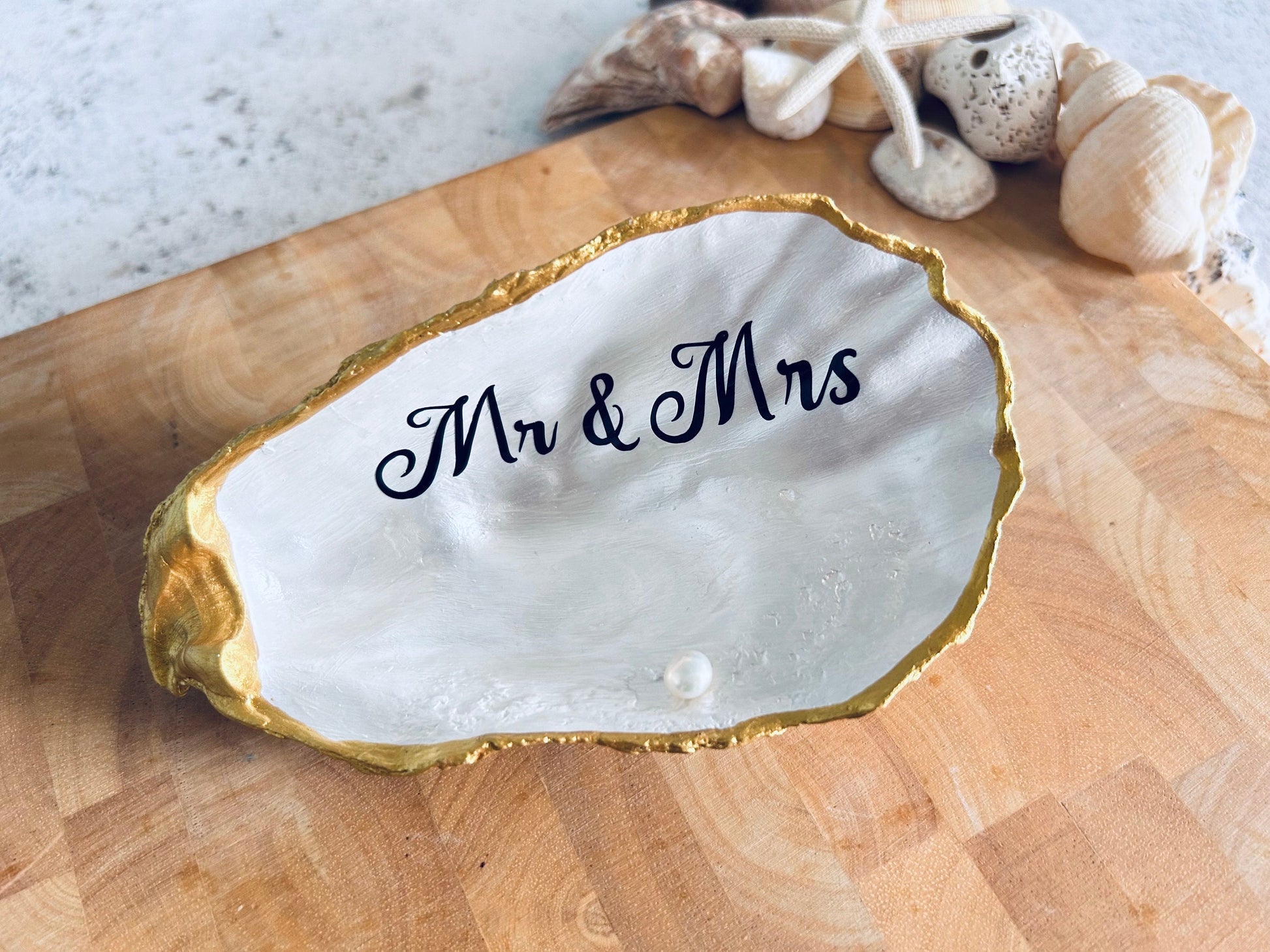 A large natural oyster shell finished in a luxurious gold with Mr & Mrs and a freshwater pearl. comes in a sustainable cotton bag for gifting. Would make a unique wedding ring holder, wedding gift or ornament. Perfect gift for the bride and groom for a beach wedding, destination wedding or a beach themed wedding.