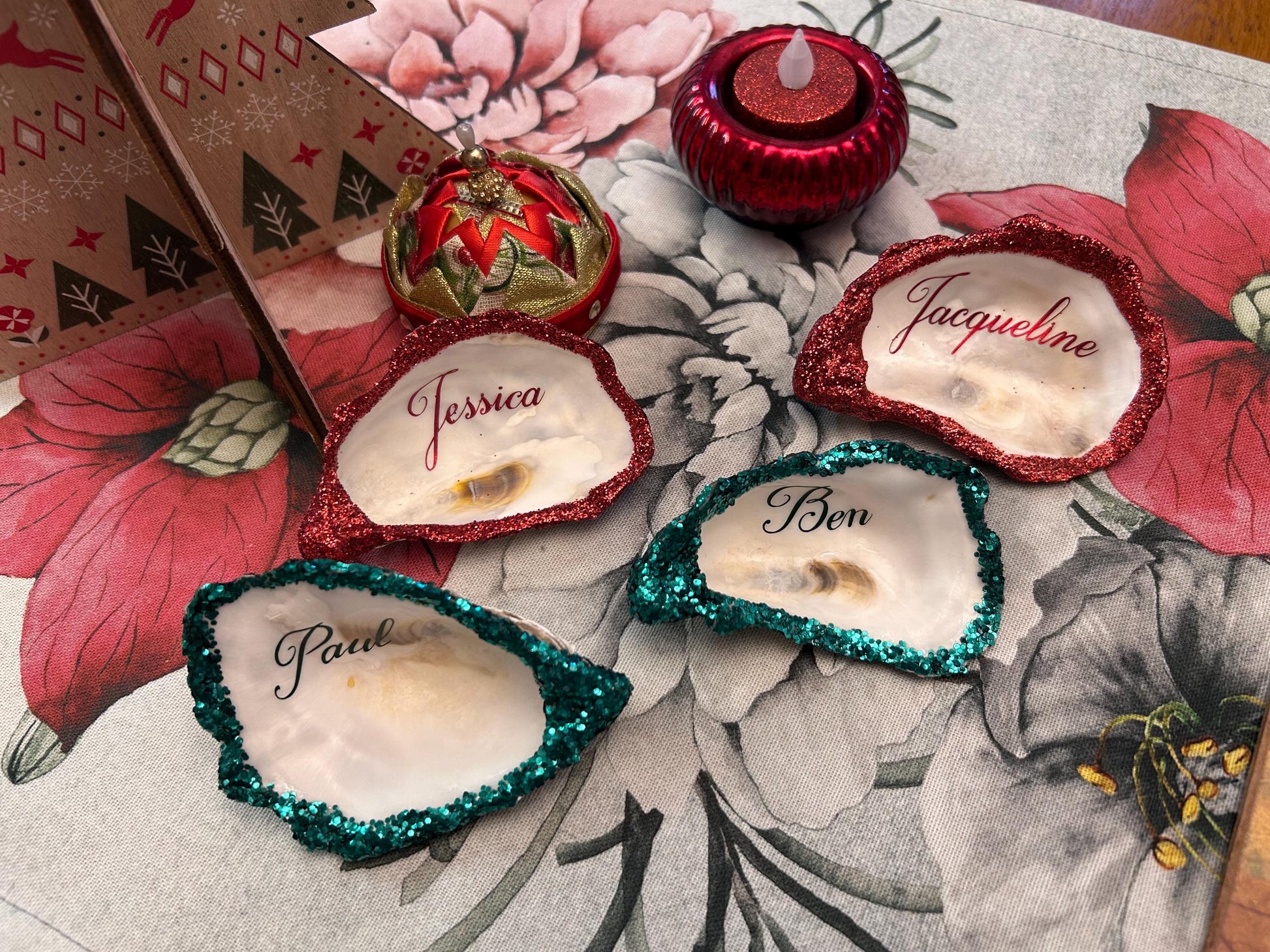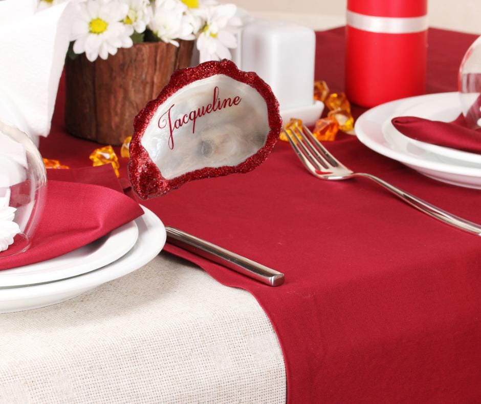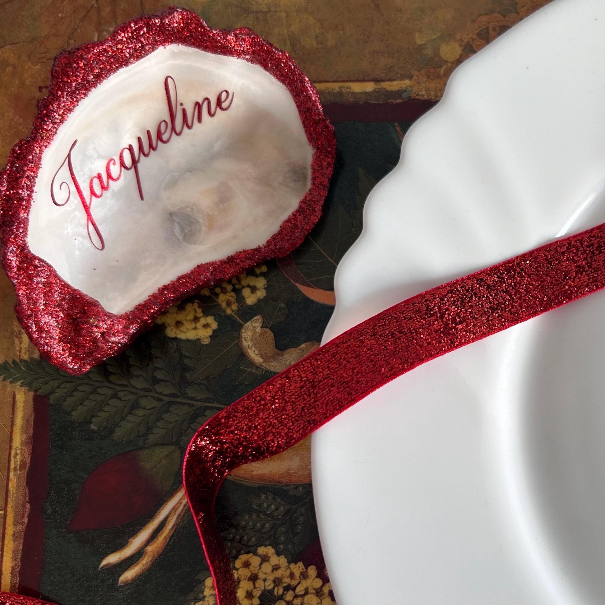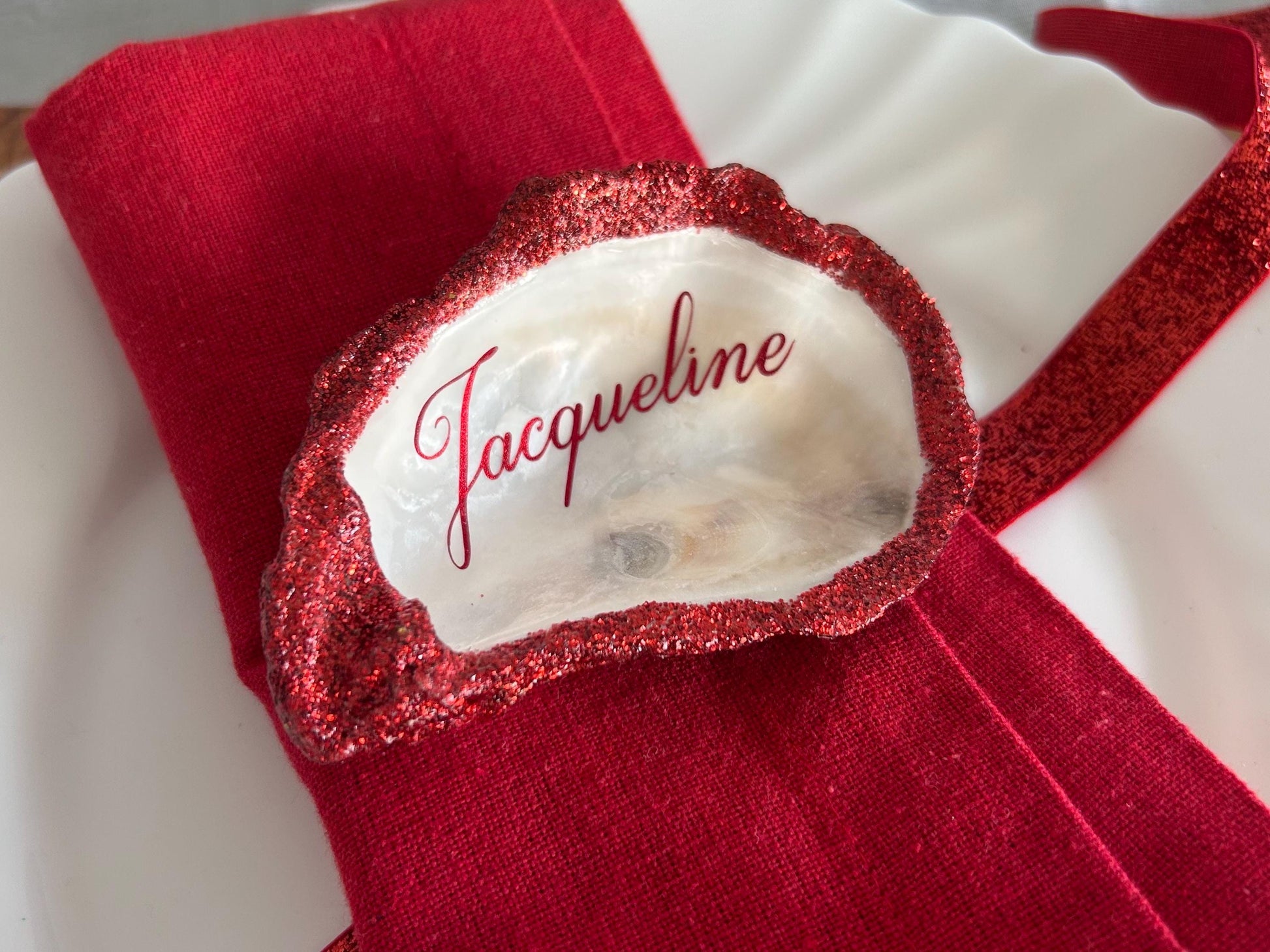 Personalised Red Glitter Oyster Shell Place Settings.