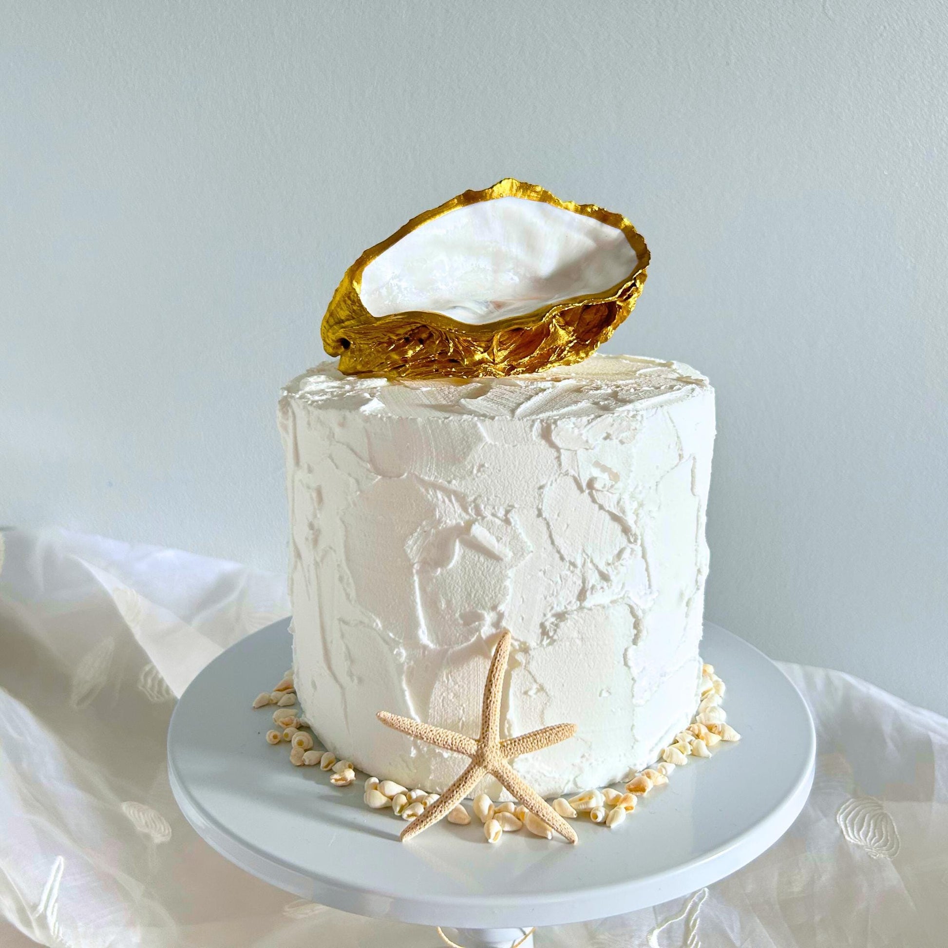 Personalised Gold Oyster Shell Cake Topper. Coastal Wedding Decoration.