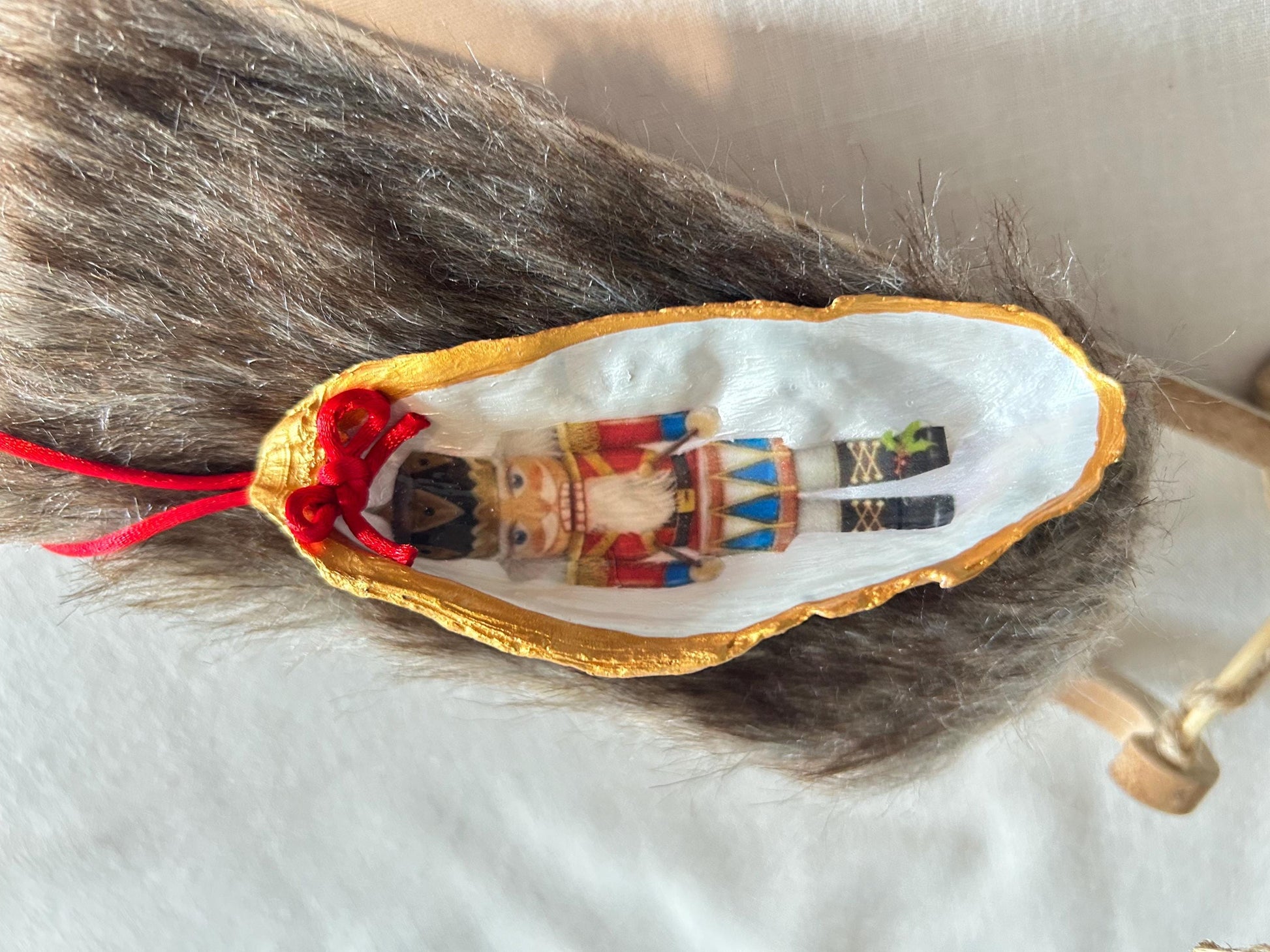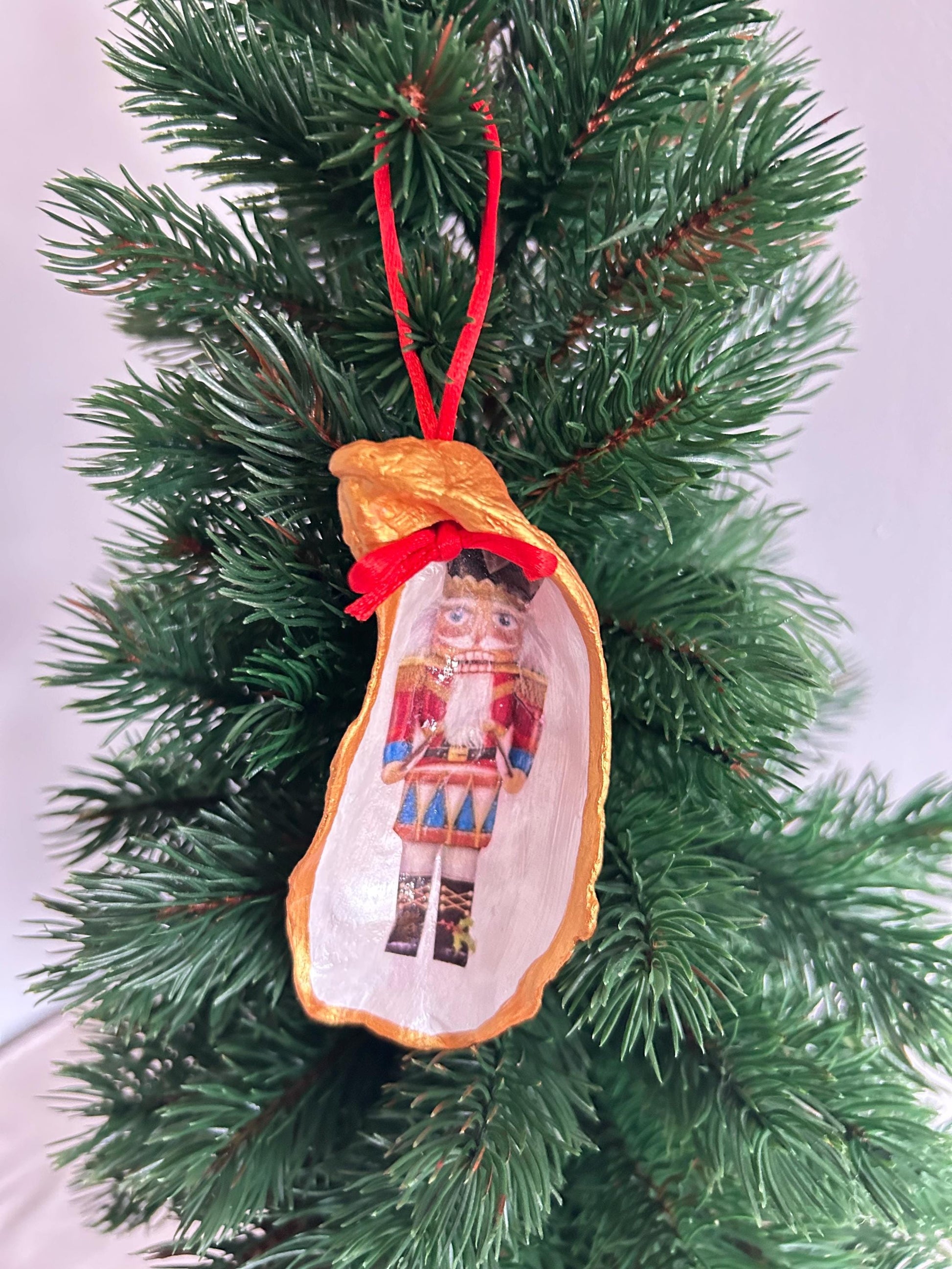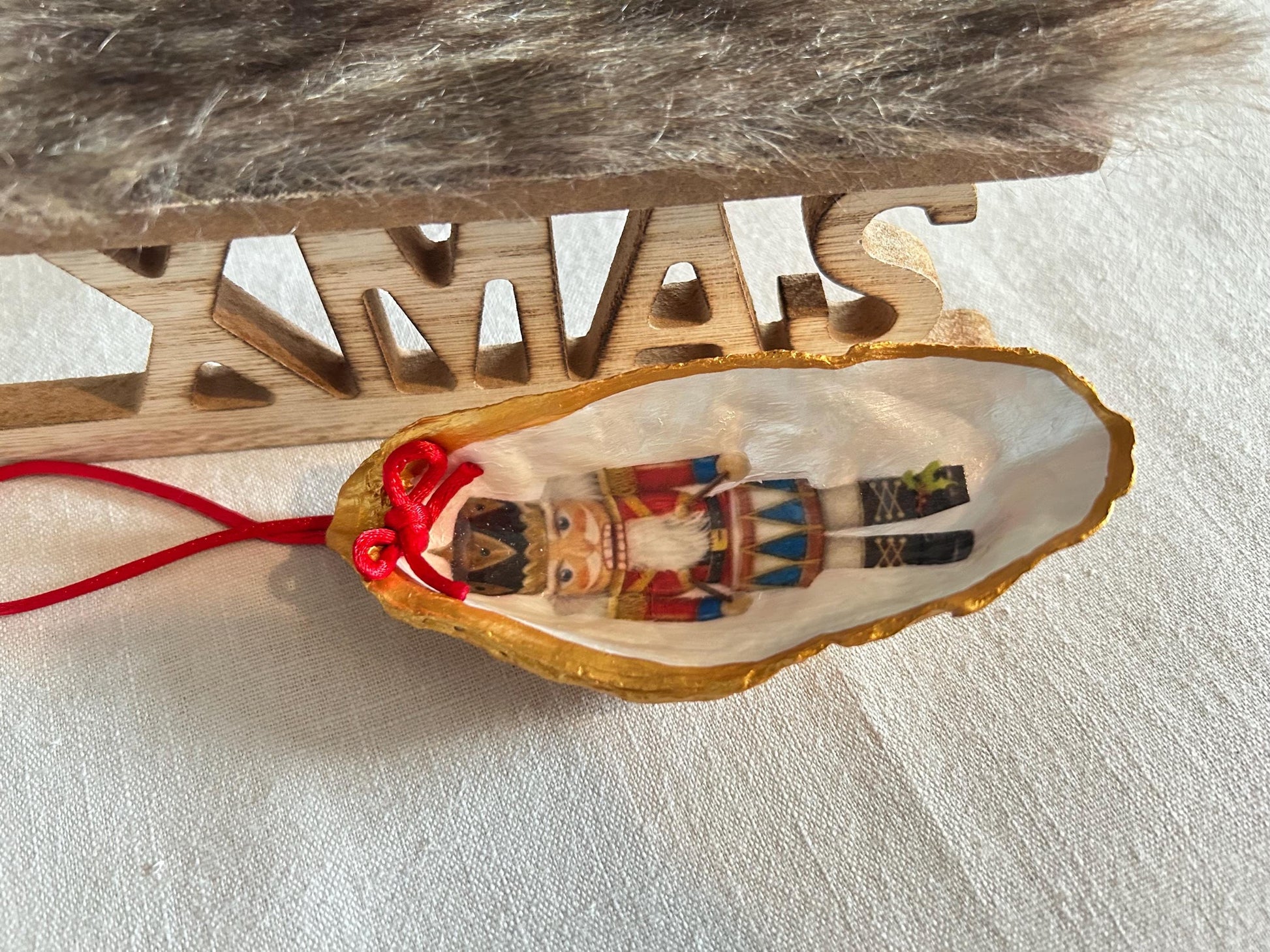 Personalised Nutcracker Oyster Shell Hanging Bauble. Festive Gold Christmas Soldier Tree Decoration.