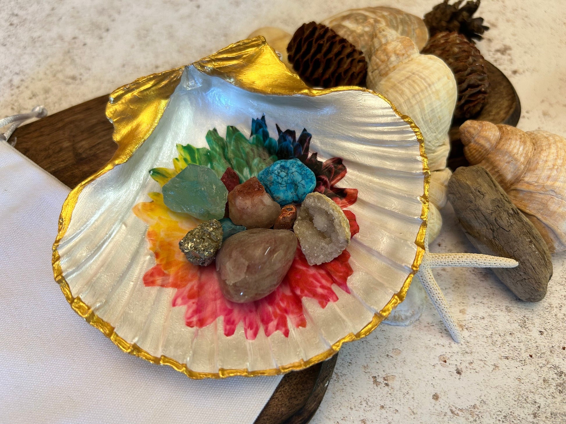 Golden Rainbow flower Natural Scallop Shell Jewellery Dish.