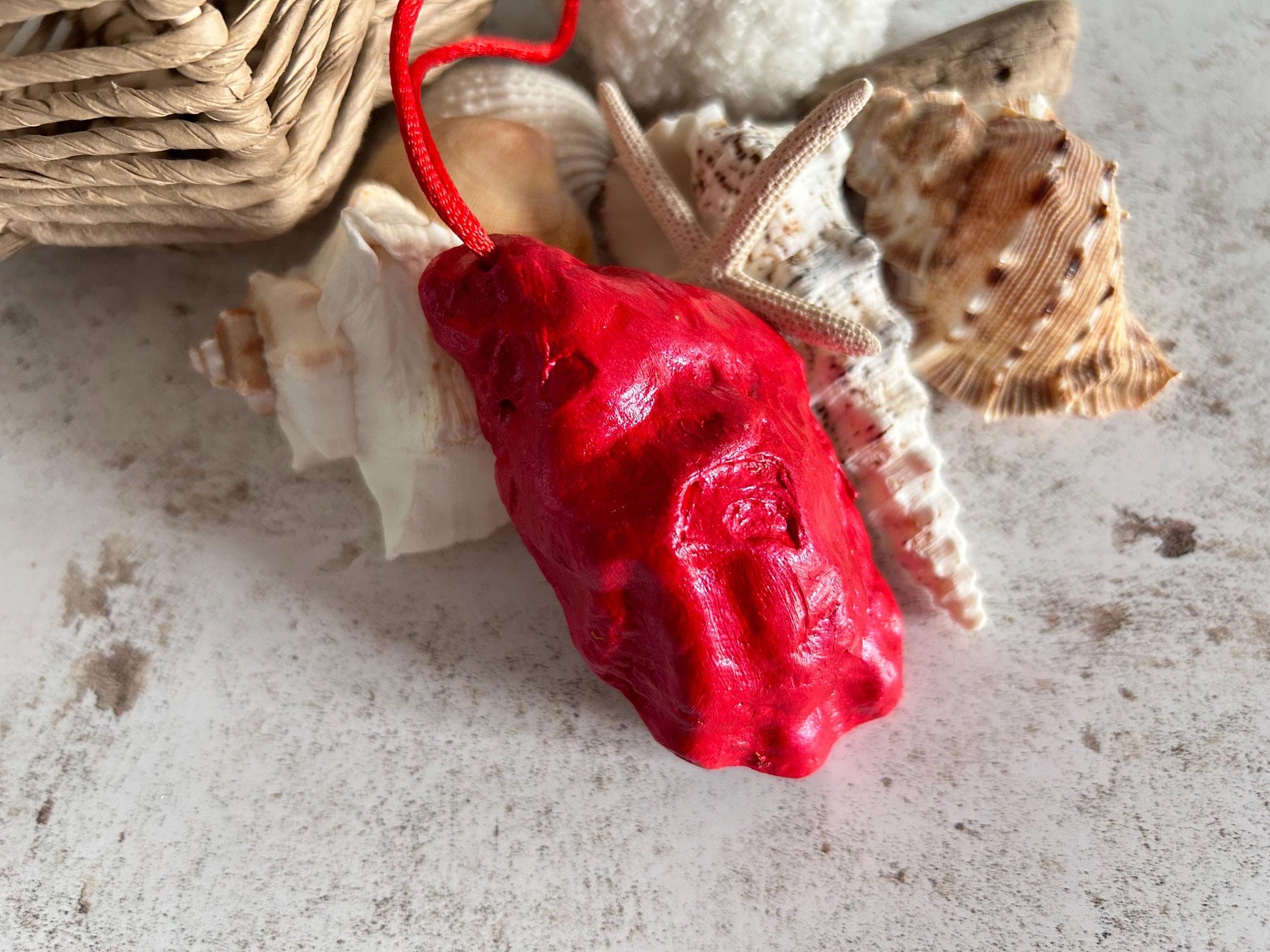 Shell measures 9 cm x 5 cm and with the luxurious red cord a total hanging length of 17cm.