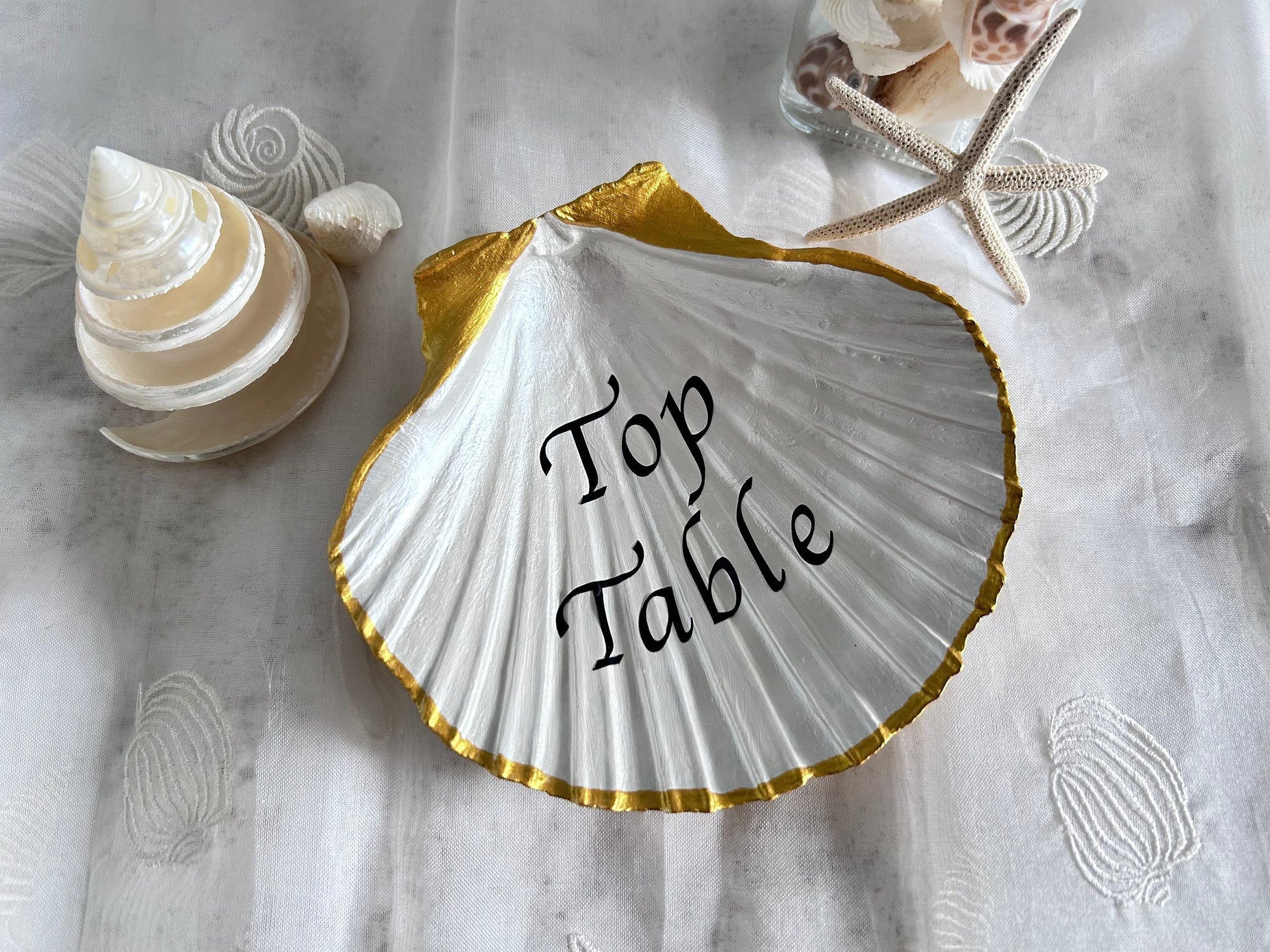 The perfect Wedding top table sign. These personalised gold scallop shells are custom coloured to your beach or wedding theme.